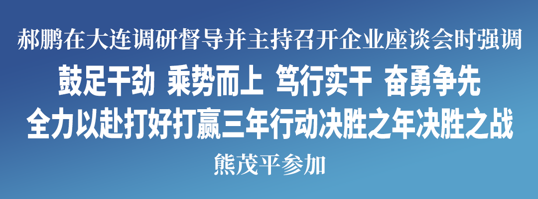 7月22日至23日,省委书记、省人大常委会主任郝鹏到大连市调研督导并主持召开企业座谈会。他强调,要深入贯彻落实习近平总书记在辽宁考察时的重要讲话和重要指示精神,鼓足干劲,乘势而上,笃行实干,奋勇争先,全力以赴打好打赢三年行动决胜之年决胜之战。省委副书记、大连市委书记熊茂平参加。