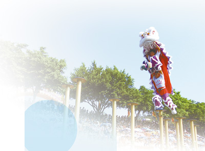 广东省佛山市南海区西樵山天湖公园,82根水上梅花桩阵高低错落,两只身披金红麟甲的醒狮飞身上桩,在直径20厘米的桩顶完成“180度转体”“钳腰饮水”等惊险动作;双狮跳上圆形擂台,扑咬、闪避、腾挪,鼓点愈急,动作愈猛,赢得满场喝彩。