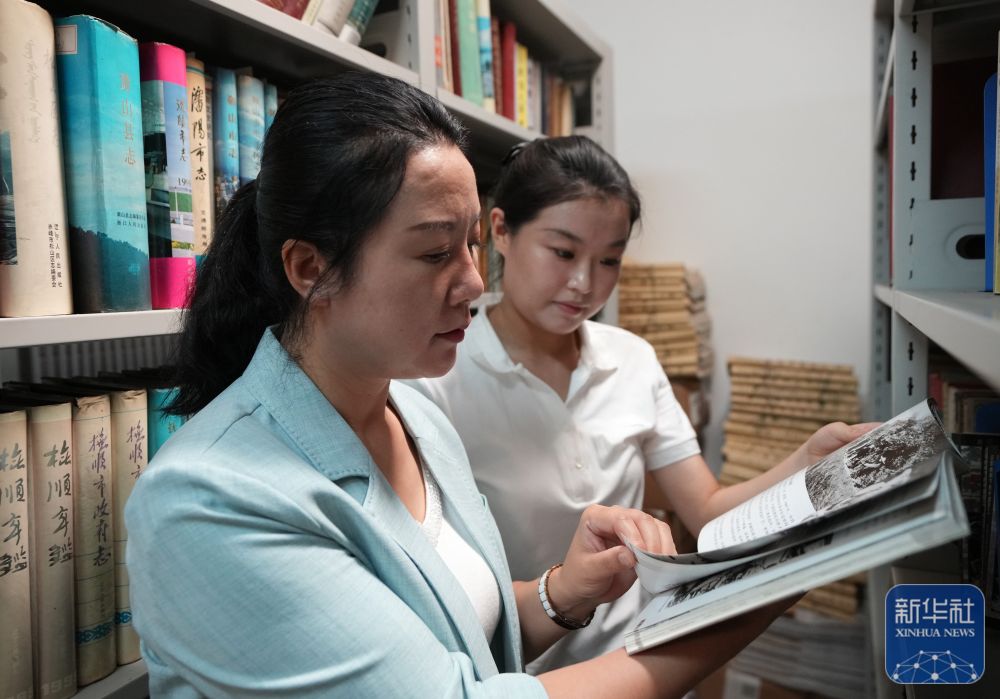 ↑ 7月28日,在“九一八”历史博物馆,石任华(左)和同事查阅资料,充实讲解内容。