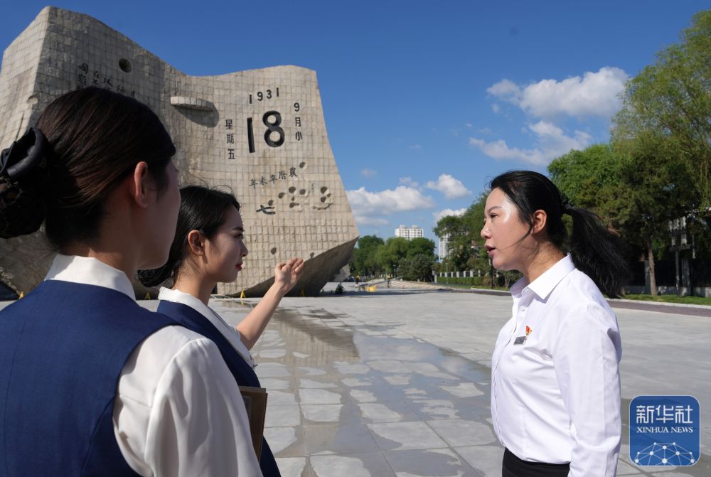 ↑ 8月4日,在“九一八”历史博物馆的残历碑广场,石任华(右一)和同事交流,拓展讲解服务形式。
