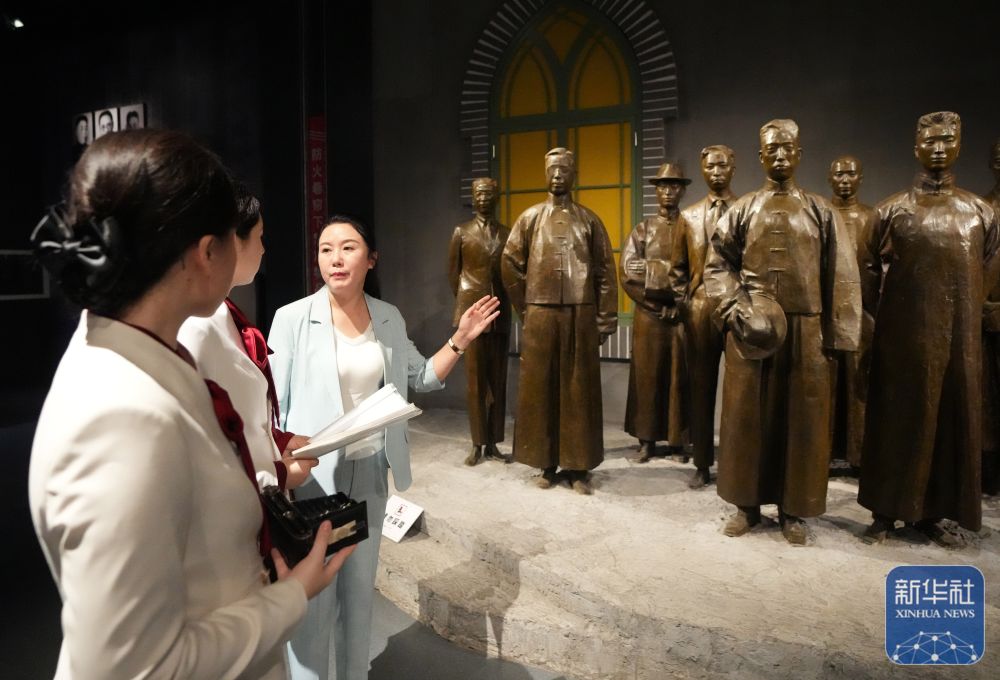 ↑ 7月28日,在“九一八”历史博物馆,石任华(左)和同事交流展陈和讲解融合技巧。