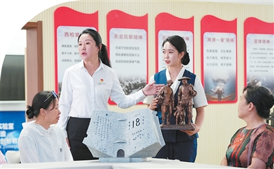 在“九·一八”历史博物馆,石任华(左一)和同事查看抗战文物。