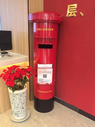 盘锦市兴隆台街道设置的人民建议征集红色邮筒。盘锦市委社会工作部供图
