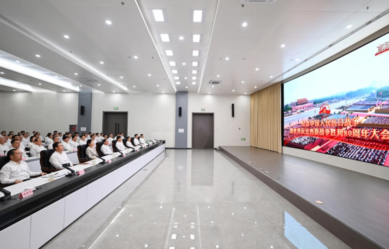 在省委、省人大常委会、省政府、省政协机关的会议厅内,陈设朴素大方,气氛庄重热烈。9时整,电视直播传来纪念中国人民抗日战争暨世界反法西斯战争胜利80周年大会盛况。80响礼炮响彻云霄,威武的护旗方阵步履铿锵。随着雄壮的《义勇军进行曲》奏响,大家全体起立,齐声高唱中华人民共和国国歌,共同注视着鲜艳夺目的五星红旗冉冉升起。随后,大家全神贯注、认真聆听习近平总书记发表重要讲话。习近平总书记的重要讲话立意高远、视野宏阔、思想深邃、内涵丰富,特别是“中华民族伟大复兴势不可挡!人类和平与发展的崇高事业必将胜利!”的庄严宣告,令人无比振奋,倍增奋进力量。历史承载过去,也启迪未来。大家深切感悟到,中华民族是不畏强暴、自立自强的伟大民族,中国共产党始终是中国人民和中华民族最可靠的主心骨,是时代巨浪中屹立不倒的中流砥柱。