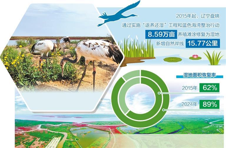 上下同欲者胜。自此,盘锦成就了全国最大的“退养还湿”单体工程。受损的湿地和自然岸线得到大幅修复,湿地碎片化问题得到有效解决。湿地面积恢复率从2015年的62%提升至2024年的89%。与此同时,盐地碱蓬人工补植技术的突破,遏制了滨海滩涂植被退化趋势,维护了辽河口滨海湿地生态系统的完整性。