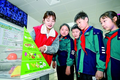 安徽省合肥市庐阳区林店街道关工委志愿者为小学生讲解健康均衡膳食知识。 赵明摄/光明图片