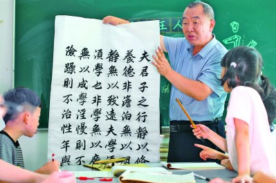 贵州省毕节市黔西市关工委组织“五老”人员开设暑期课堂,指导孩子们学习书法、绘画等,丰富他们的生活。周训超摄/光明图片