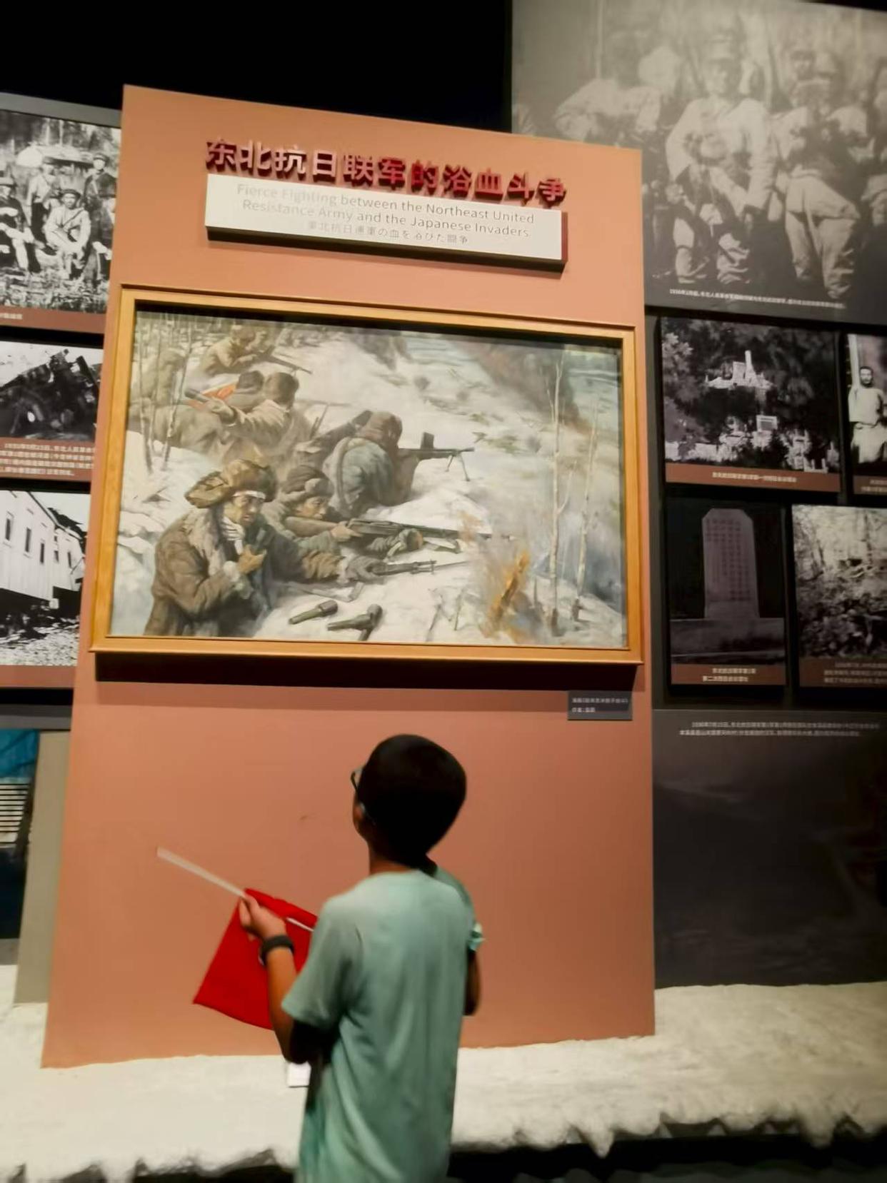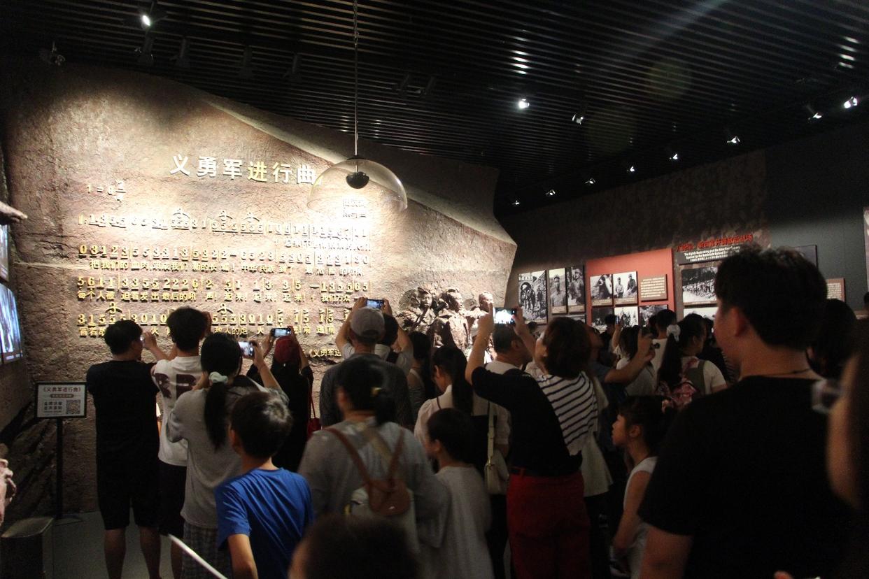 “起来!不愿做奴隶的人们!把我们的血肉,筑成我们新的长城……”在展厅的国歌墙前,一句歌声打破寂静,不知是谁起头唱起了国歌,随后一群少年加入合唱。“冒着敌人的炮火,前进!前进!前进!进!”唱到最后,歌声仿佛成了呐喊,周围的参观者没人发出声音,展馆内只有《义勇军进行曲》的铿锵旋律在回荡。
