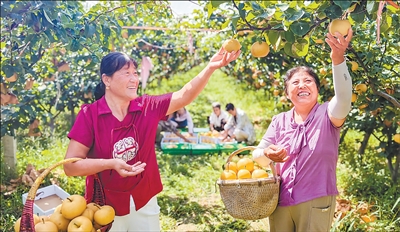 山东乐陵市铁营镇大白张村“深耕”盐碱地,种出“黄金梨”,带动农民增收。图为村民们在采摘梨子。
