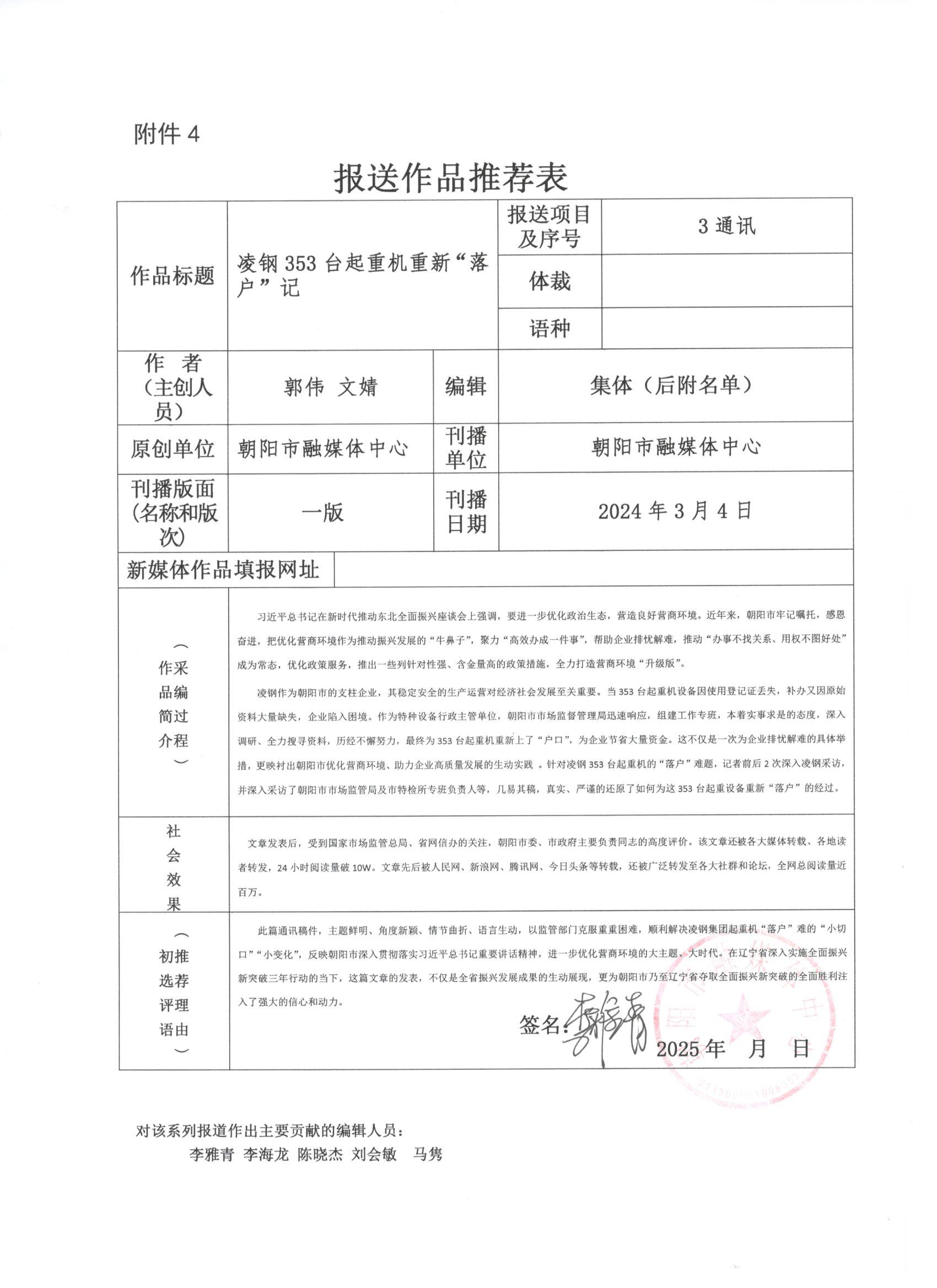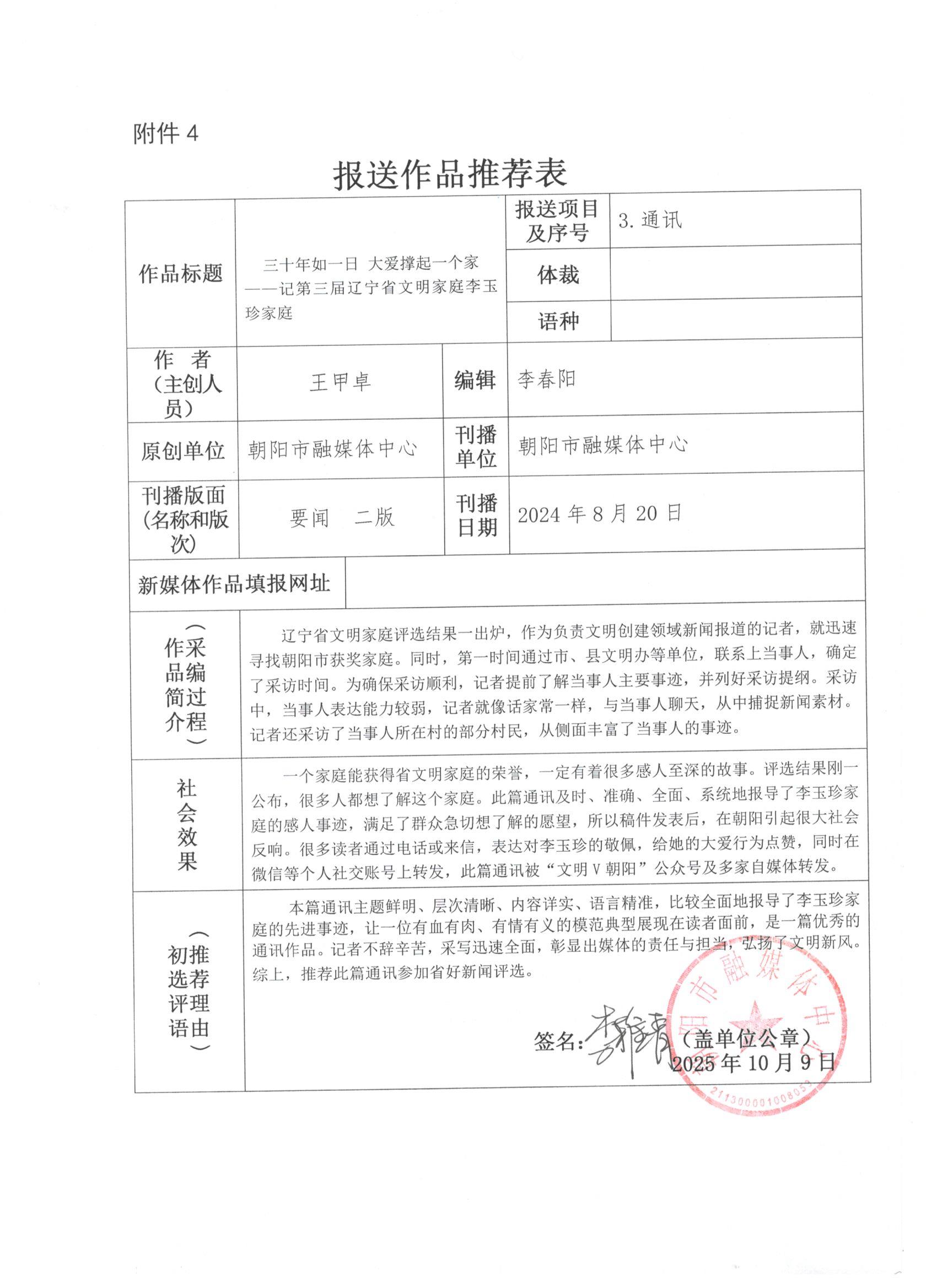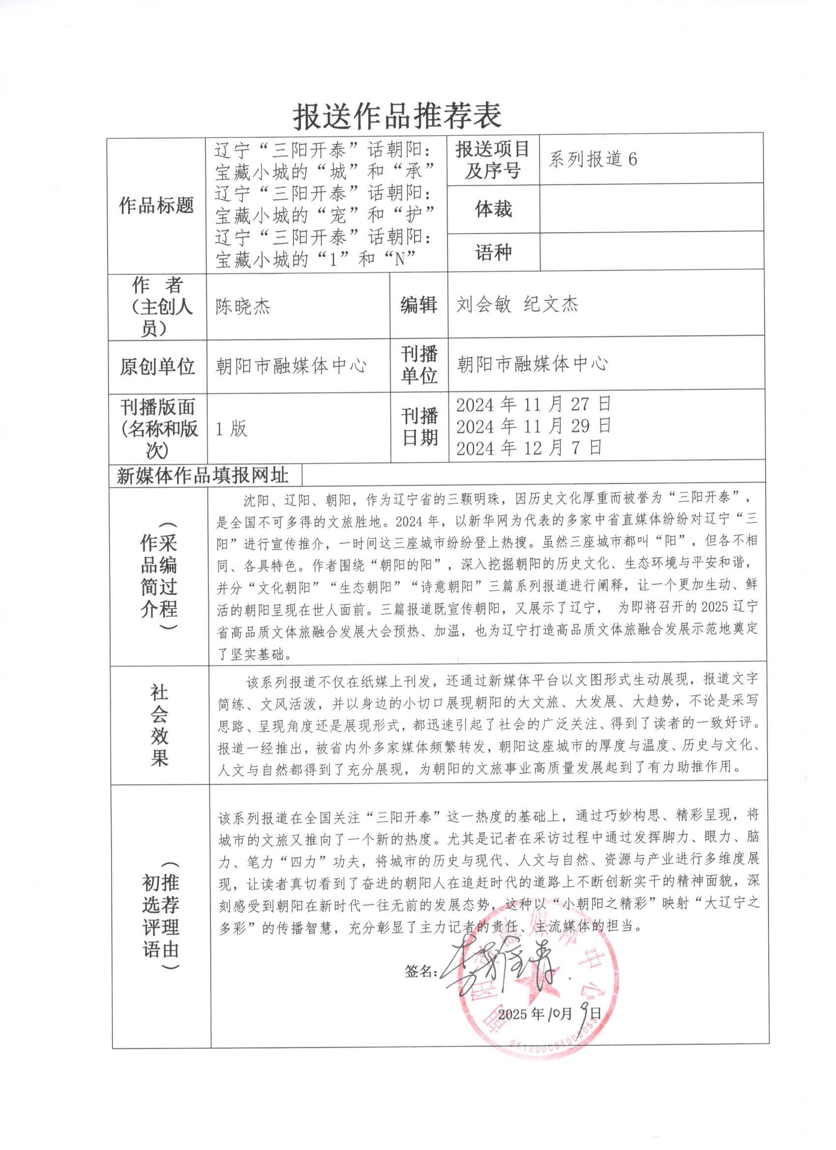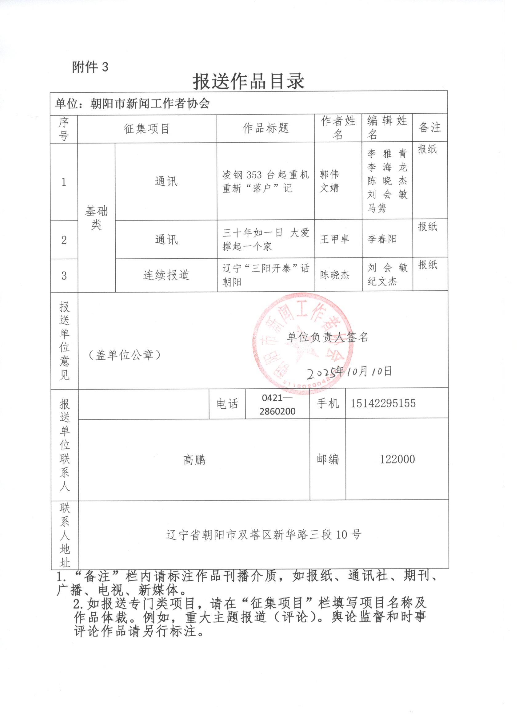 按照要求,朝阳市新闻工作者协会对参评“第34届辽宁新闻奖”的作品进行公示,现将报送作品目录和推荐表公示如下: