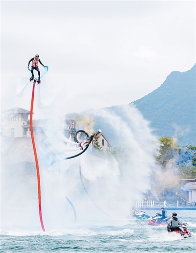 广东省广州市增城区,依托废弃矿湖、温泉等资源打造的森林海旅游度假区内正在进行水上表演。 王 剑摄(人民视觉)